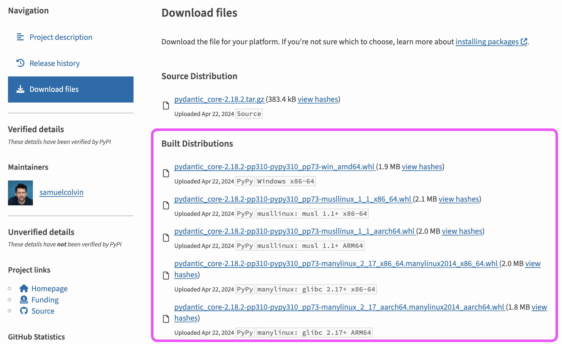 We say "probably" because that pure package could depend on a non-pure package which brings you to the next section. For example, pydantic is a pure package, but to work properly it requires pydantic-core non-pure package written in Rust.