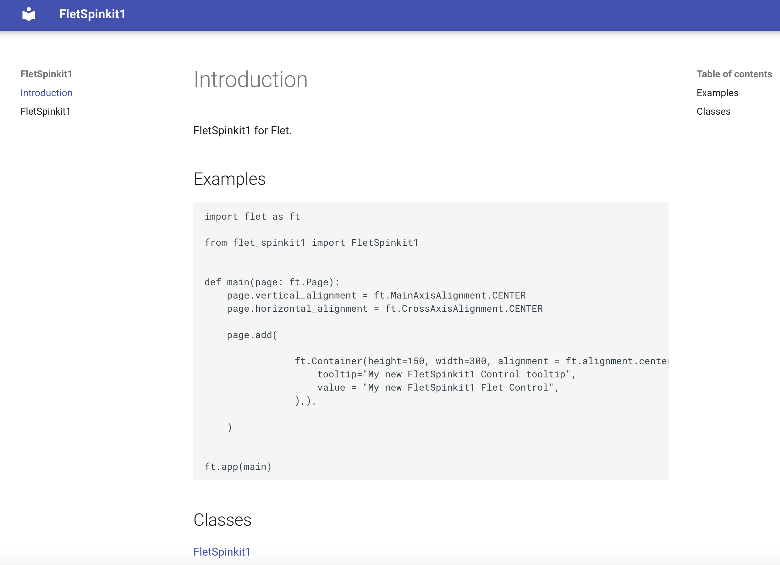 Flet extension comes with a docs folder containing initial files for your documentation and a mkdocs.yml file at the project root.